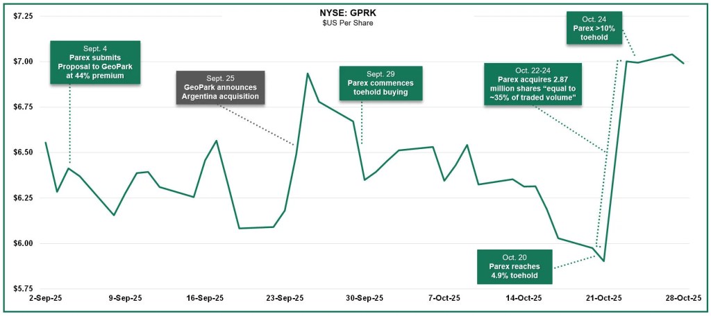 una prima del 51% sobre el precio de las acciones de GeoPark al 21 de octubre de 2025, el día hábil inmediatamente anterior al momento en que Parex adquirió una participación superior al 5% en GeoPark;