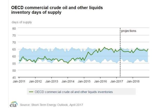 Según los pronósticos de la Agencia de la Energía de EEUU, la reservas en la OCDE se mantendrán históricamente altas en 2017 y en 2018, en ambos años la media estará por encima de los 3.000 millones de barriles.