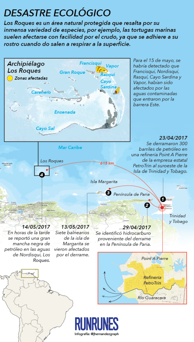 El Archipiélago de Los Roques fue afectado por el derrame de 300 barriles petróleo ocurrido en la refinería Point-A-Pierre de la empresa estatal PetroTrin, en Trinidad y Tobago, el pasado 23 de abril. No fue sino hasta el domingo 14 de mayo, alrededor de las 4:30 pm, cuando se detectó por primera vez la presencia de manchas de petróleo en aguas de la isla de Nordisquí, al extremo noroeste del parque nacional.