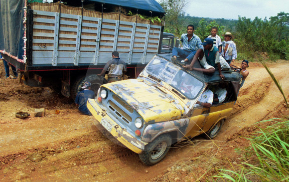 Pues bien, en el paquete de obras, que se conoció el 5 de junio en un gran evento en la Casa de Nariño y en el que Santos aseguró que las trochas se convertirían en los caminos de la paz; hay dos cosas que llaman la atención. La primera es una particular forma de contratación. La segunda, la participación de las juntas de acción comunal, a las cuales se les han adjudicado directamente 170 contratos, según información de la Agencia de Renovación del Territorio, ART. En total, el dinero entregado a las comunidades está por el orden de los 3.4000 millones de pesos para que se lo gasten en mantenimiento de trochas, como la de la foto.