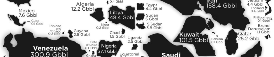 El colectivo ha elaborado una cartografía global del petróleo a partir de las reservas declaradas de cada país. La información, proveniente del CIA Factbook, hace referencia al petróleo conocido. Es decir, a la cantidad de crudo extraíble y comercialmente viable en base a las más precisas estimaciones geológicas. Como el mapa ilustra, hay poca correlación entre el tamaño de un país y sus reservas de petróleo.