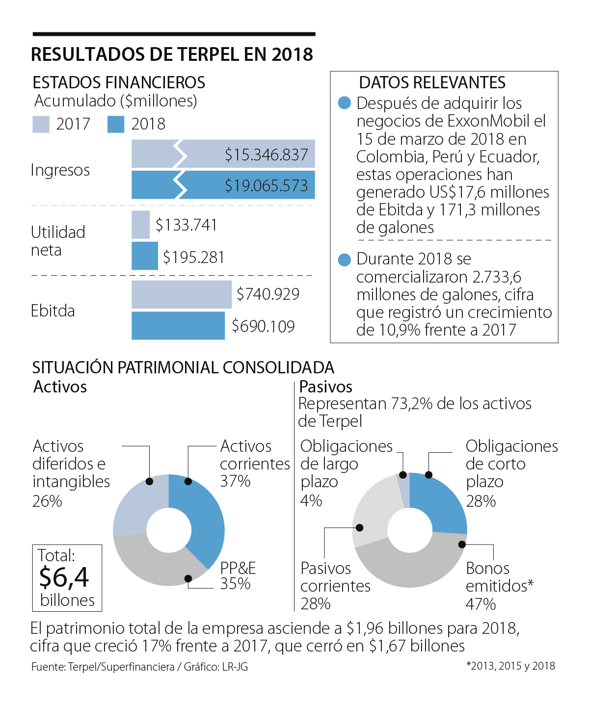 Actualmente, y tras obtener el control de las operaciones de ExxonMobil, estas le han generado a Terpel US$17,6 millones de ebitda y 171,3 millones de galones al cierre de 2018, según destacan los resultados financieros de la empresa, que se dieron a conocer ayer a través de la Superfinanciera.