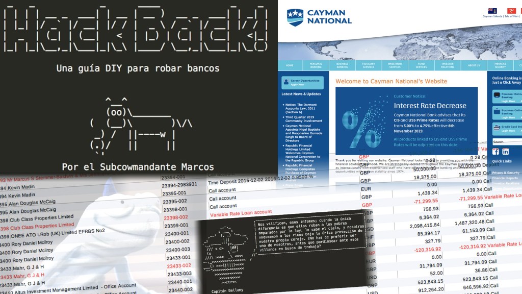 Con un poco de poesía, canciones, menciones de Guy Fawkes, de Salvador Dalí, Fsociety y del Subcomandate Marcos, en las últimas horas se ha conocido un hackeo masivo que afecta al banco (y su fideicomiso #offshore) Cayman National Bank and Trust en la Isla de Man (UK), afectando a más de 1.500 cuentas consideradas como «opacas».