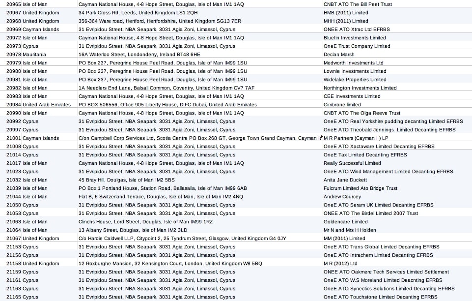 De todo el conjunto de datos, el análisis de las ubicaciones de más de 1.500 cuentas de clientes incluye 780 de la Isla de Man, 272 de Chipre, 153 del Reino Unido, 107 de las Islas Caimán, 51 de las Islas Vírgenes Británicas, 12 de las Seychelles, 11 de los Estados Unidos, 7 de Belice, 7 de Irlanda y un pequeño número de otras jurisdicciones involucradas en la banca offshore, incluyendo Gibraltar, Jersey, Saint Kitts y Nevis, Barbados, Guernsey, Malta y Mauricio.
