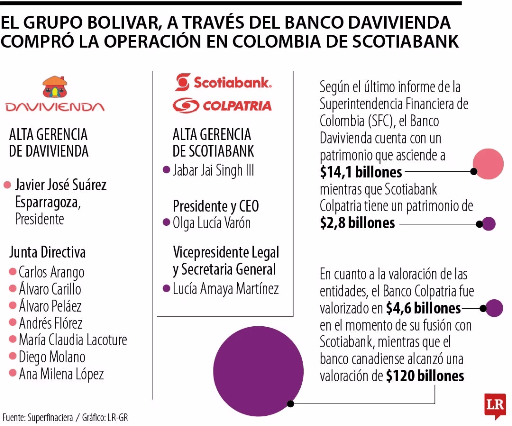 En cuanto a la valoración de las entidades, el Banco Colpatria fue valorizado en $4,6 billones en el momento de su fusión con Scotiabank, mientras que el banco canadiense alcanzó una valoración de $120 billones, según los datos de la Superintendencia Financiera.